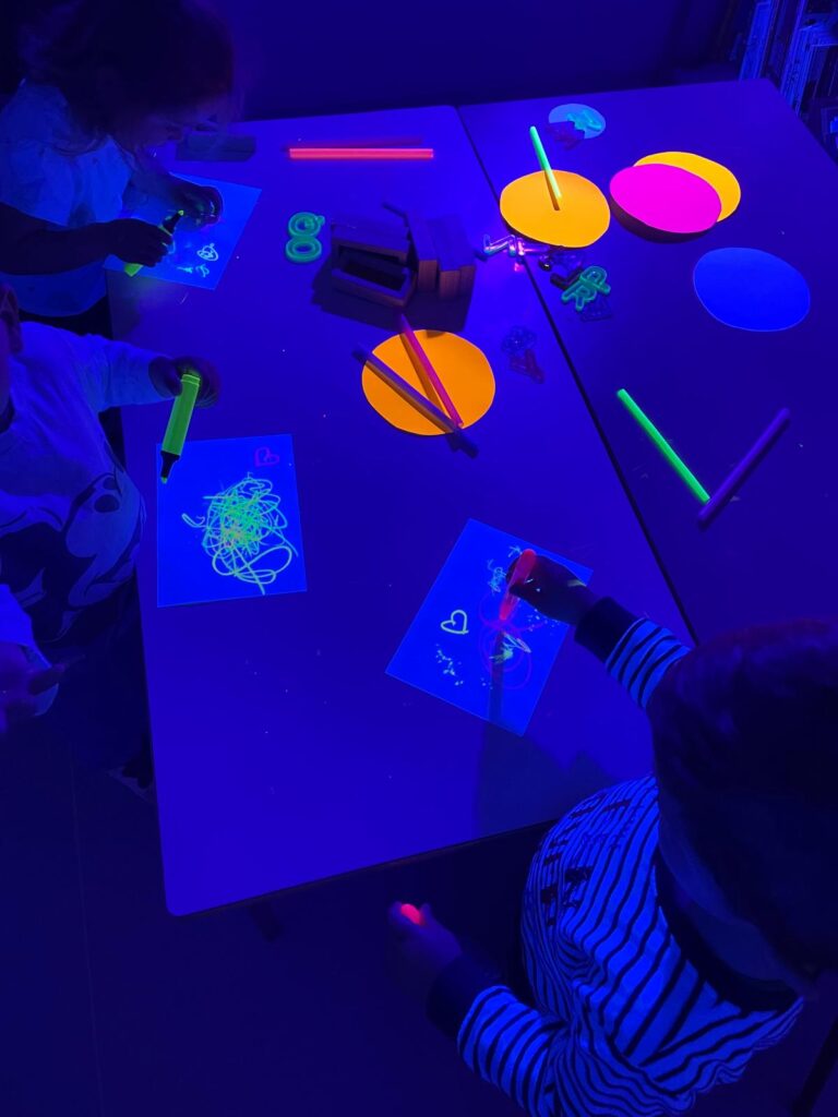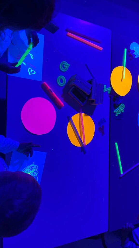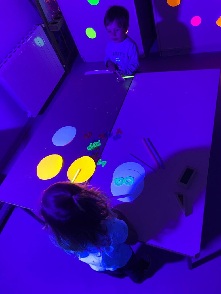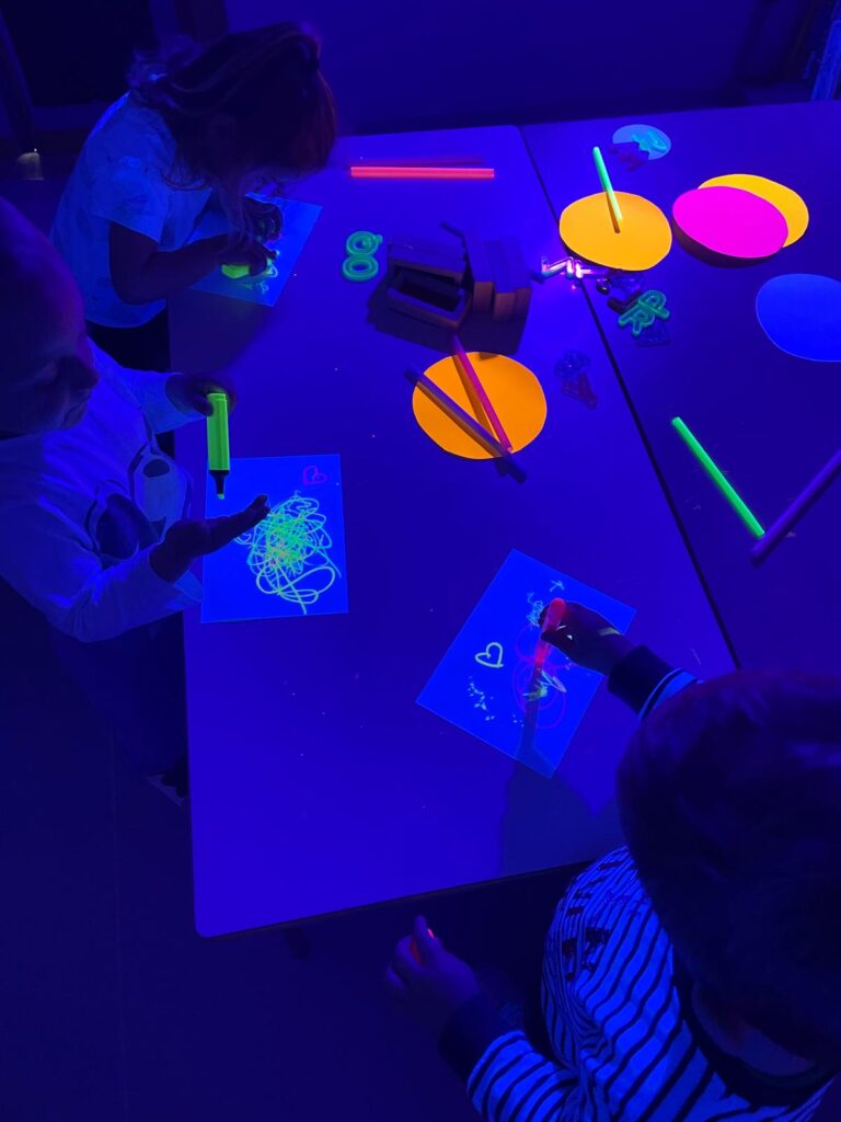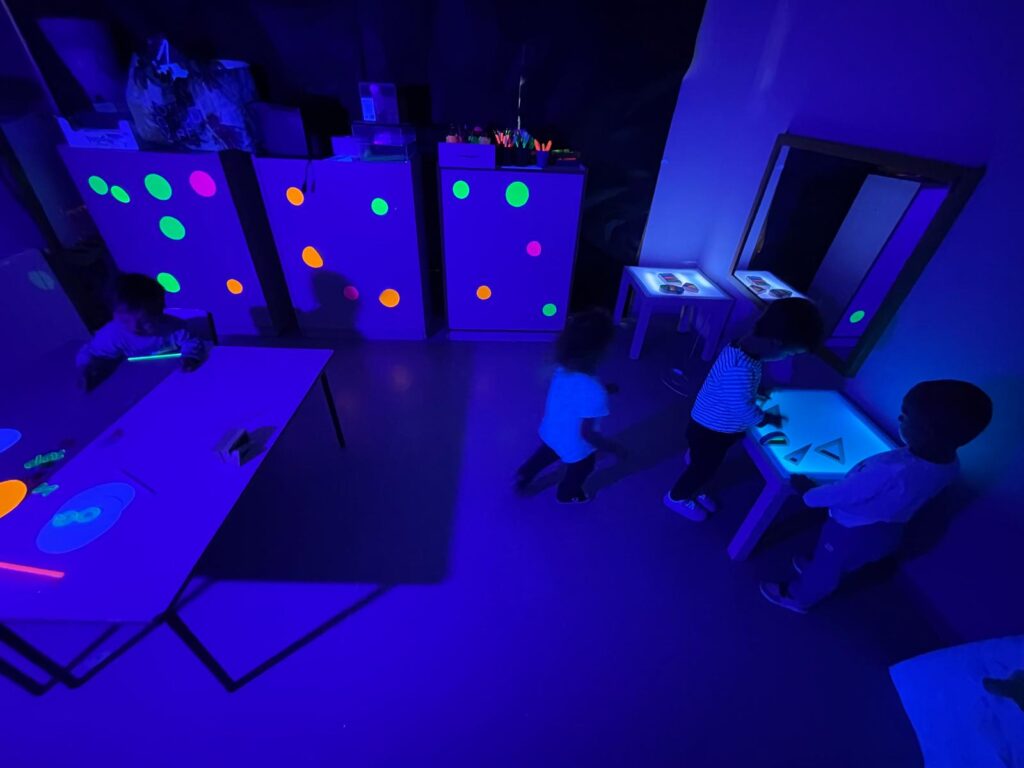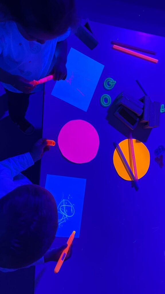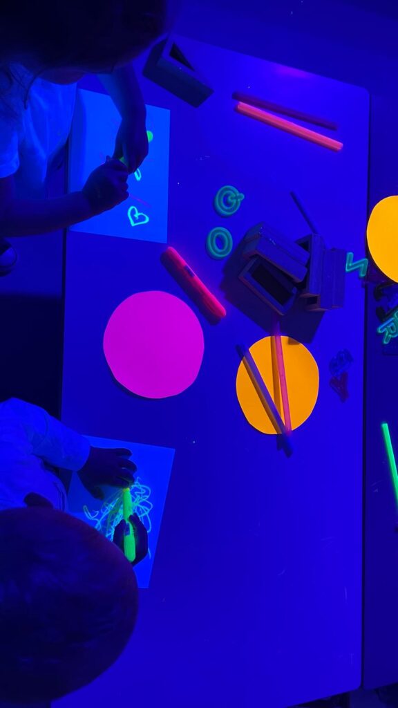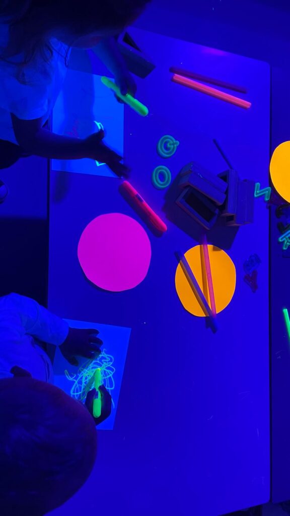 A la nostra escola infantil, creem espais màgics que desperten la curiositat i la creativitat. L’aula de la “llum negra” és un lloc especial on els infants exploren la llum, les ombres i els colors a través del joc lliure i l’experimentació.